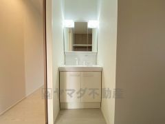 三面鏡つき洗面台。収納も一体型になっているので、ドライヤーやヘアアイロンの置き場に困りませんね。