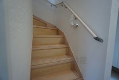 ご年配の方でも安心できる、手すり付き階段です^^段差も低めで設定されてますので安全性にも優れてますね^^