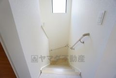 小さなお子様やご高齢の方でも安心できる、手すり付き階段。段差も低めで設定されており、安全性にも優れています。