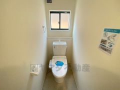 温水洗浄機付トイレです。節水機能もあるので、安心して使えますね。もちろん、1階2階の2ヶ所にトイレがあるので、忙しい朝にもゆとりができますね。