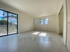 大きな窓のあるリビングは、陽光あふれる明るい空間です。居心地良く、ご家族皆がゆったり寛げる憩いの空間となりそうです。