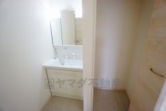 同仕様写真。レバーシャワーで引き出して使用できます。収納も一体型になっているので、ドライヤーやヘアアイロンの置き場に困りませんね。