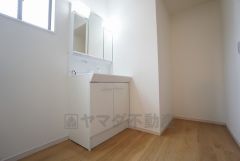同仕様写真。三面鏡つき洗面台。収納も一体型になっているので、ドライヤーやヘアアイロンの置き場に困りませんね。