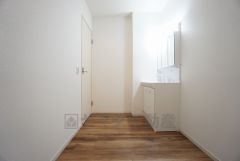 同仕様写真。三面鏡つき洗面台。収納も一体型になっているので、ドライヤーやヘアアイロンの置き場に困りませんね。