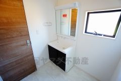 同仕様写真。三面鏡つき洗面台。収納も一体型になっているので、ドライヤーやヘアアイロンの置き場に困りませんね。