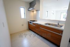 同仕様写真。対面式カウンターキッチンでお子様の様子が見守れます。カウンタートップは耐熱性に優れており、日ごろのお掃除もふき取るだけでOK。ステンレスシンクも簡単にお掃除できますよ。
