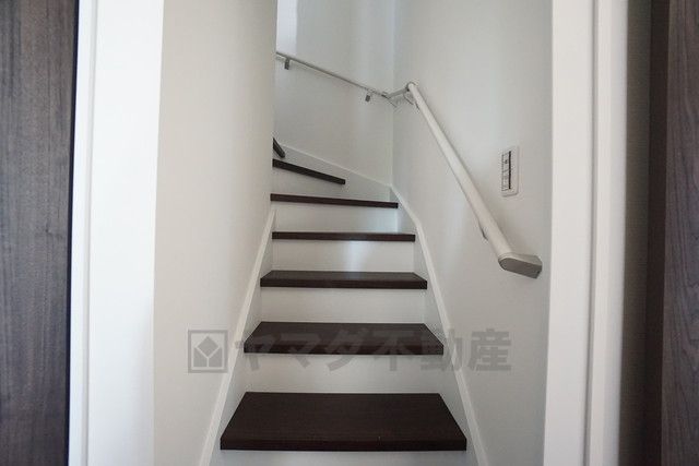 小さなお子様やご高齢の方でも安心できる、手すり付き階段。段差も低めで設定されており、安全性にも優れています。