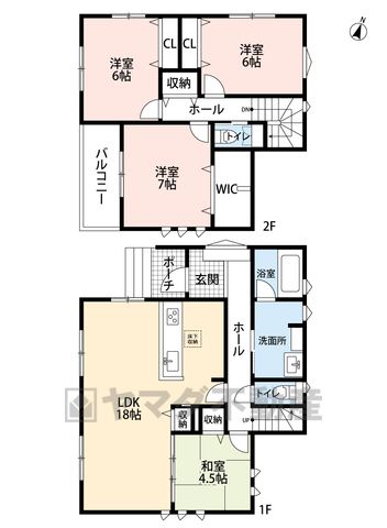 LDK18畳(1F)、和4.5畳(1F)、洋6畳(2F)、洋7畳(2F) |
