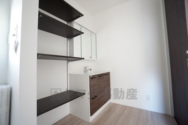 三面鏡つき洗面台。鏡裏にたっぷりとした収納スペースがあります。鏡を閉めてしまえば小物は見えないため、スッキリとした印象の洗面台にできます。