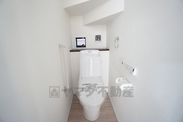温水洗浄機付トイレです。節水機能もあるので、安心して使えますね。もちろん、1階2階の2ヶ所にトイレがあるので、忙しい朝にもゆとりができますね。