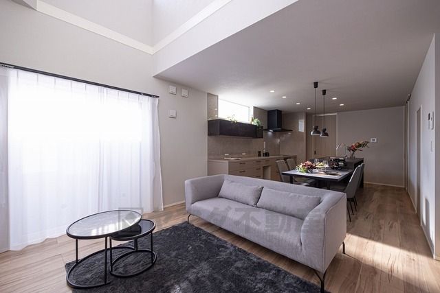 吹抜けが開放的なLDK。東南に窓を設置しているので非常に明るいですよ^^