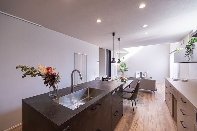 濃いグレーキッチンの存在感が引き立ちます^^