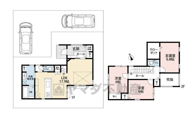 LDK17.9畳(1F)、洋6.8畳(2F)、洋6畳(2F) |