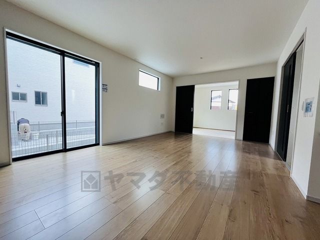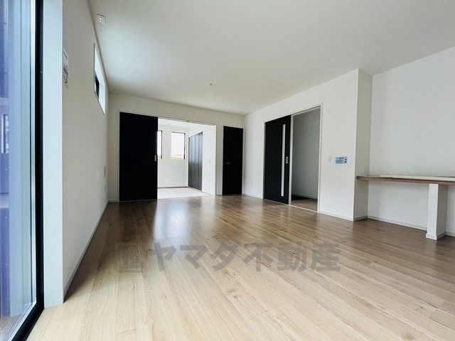 大きな窓のあるリビングは、陽光あふれる明るい空間です。居心地良く、ご家族皆がゆったり寛げる憩いの空間となりそうです。