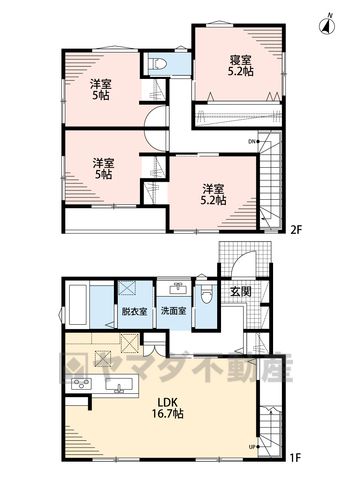 LDK16.7畳(1F)、洋5.2畳(2F)、洋5畳(2F) |