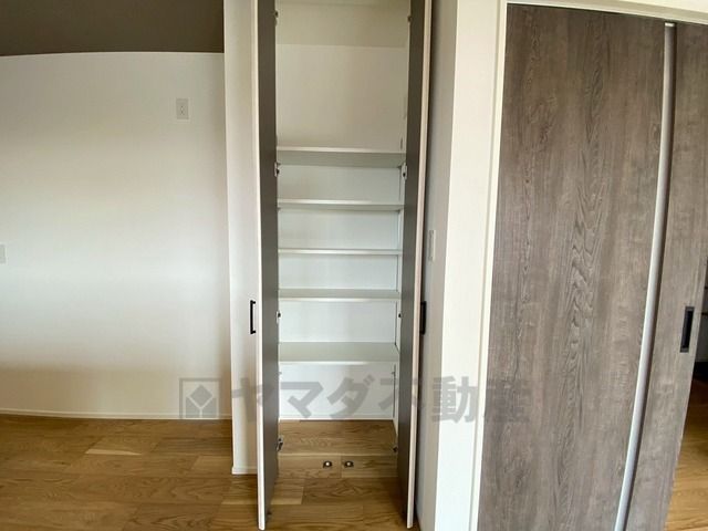 キッチン横パントリー。食器やキッチン用品、食料品の保存に便利です^^可動棚式なので高さのある物もスッキリ収納できます^^