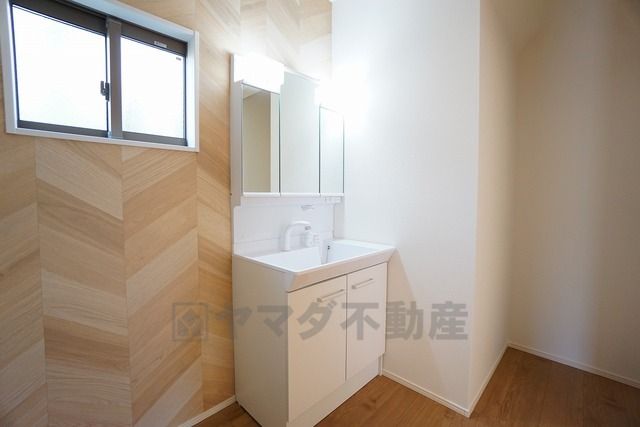 三面鏡つき洗面台。収納も一体型になっているので、ドライヤーやヘアアイロンの置き場に困りませんね。