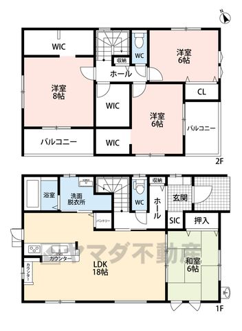 LDK18畳(1F)、和6畳(1F)、洋8畳(2F)、洋6畳(2F) |