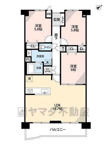| 間取り詳細 | LDK18.7畳、洋6畳、洋5.8畳、洋5.6畳 | 土地権利 | 所有権 |
