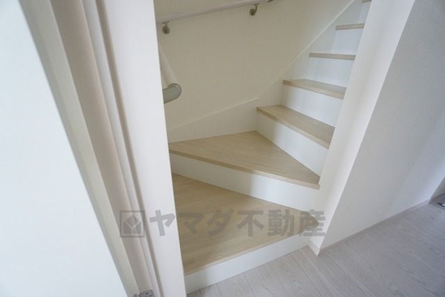 ご年配の方でも安心できる、手すり付き階段です^^段差も低めで設定されてますので安全性にも優れてますね^^