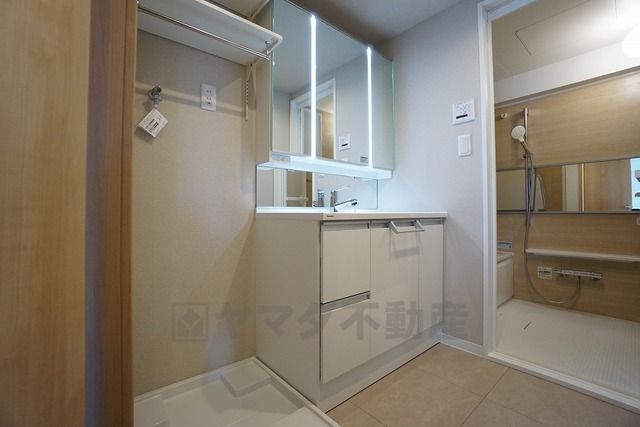 三面鏡つき洗面台。収納も一体型になっているので、ドライヤーやヘアアイロンの置き場に困りませんね。