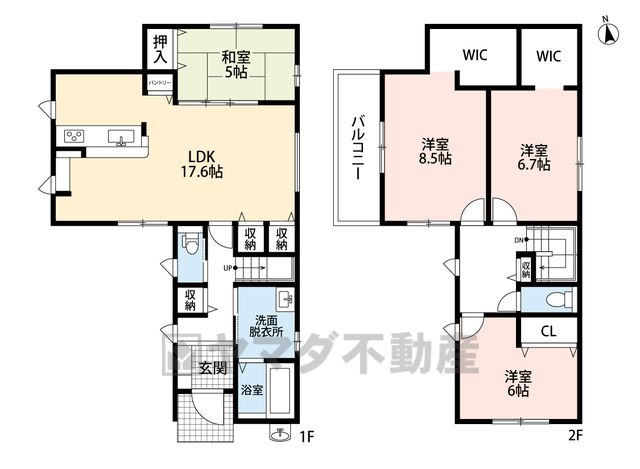 LDK17.6畳(1F)、和5畳(1F)、洋8.5畳(2F)、洋6.7畳(2F)、洋6畳(2F) |