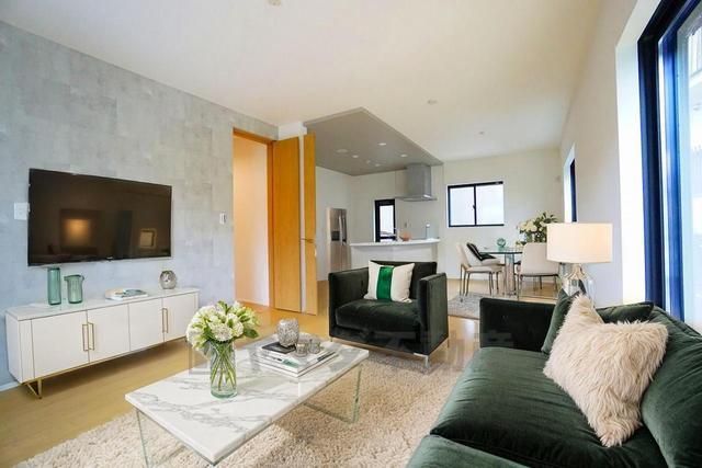家具・インテリアはCGイメージ画像です。家族が集まる開放的なリビング。約18帖の大空間で毎日のお食事が楽しみです^^
