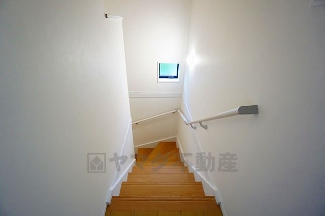 ご年配の方でも安心できる、手すり付き階段です^^段差も低めで設定されてますので安全性にも優れてますね^^