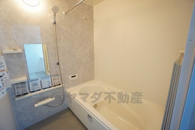 1日の疲れを癒すくつろぎのバスルーム。足を伸ばしてもゆったりと入れるサイズです。お子様と一緒にお風呂に入っても狭くないですね^^