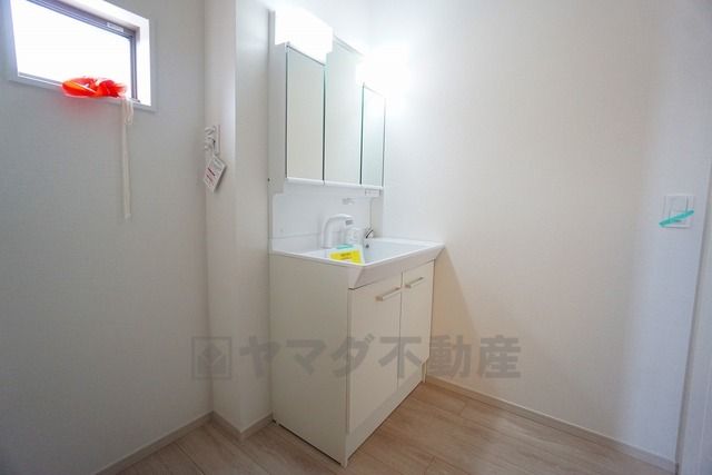 三面鏡つき洗面台。収納も一体型になっているので、ドライヤーやヘアアイロンの置き場に困りませんね。