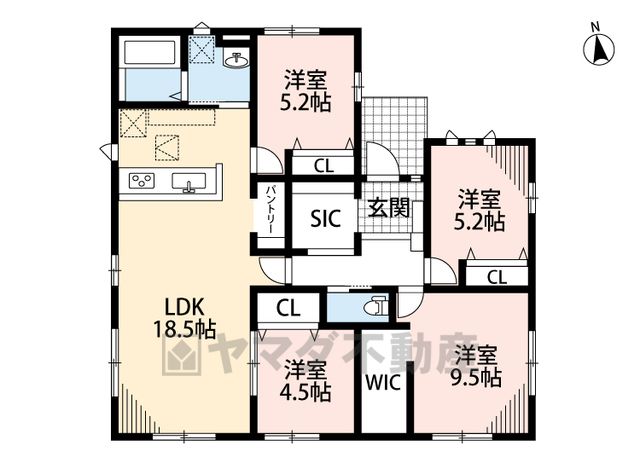 LDK18.5畳(1F)、洋9.5畳(1F)、洋5.2畳(1F)、洋4.5畳(1F) |