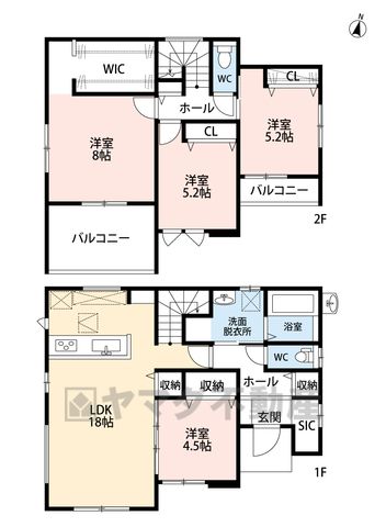 LDK18畳(1F)、洋4.5畳(1F)、洋8畳(2F)、洋5.2畳(2F) |