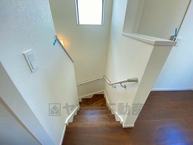 小さなお子様やご高齢の方でも安心できる、手すり付き階段。段差も低めで設定されており、安全性にも優れています。