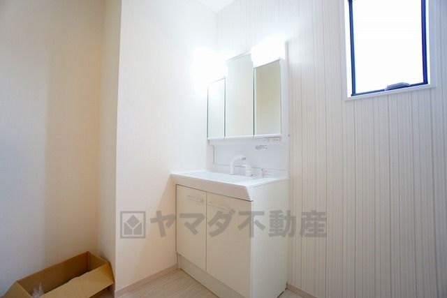 三面鏡つき洗面台。鏡裏にたっぷりとした収納スペースがあります。鏡を閉めてしまえば小物は見えないため、スッキリとした印象の洗面台にできます。