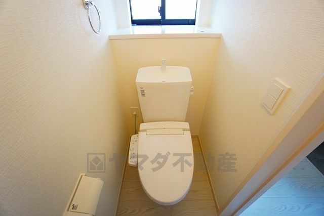 温水洗浄機付トイレです。節水機能もあるので、安心して使えますね。もちろん、1階2階の2ヶ所にトイレがあるので、忙しい朝にもゆとりができますね。