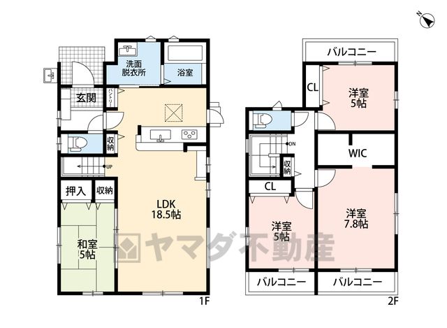 LDK18.5畳(1F)、和5畳(1F)、洋5畳(2F)、洋7.8畳(2F) |