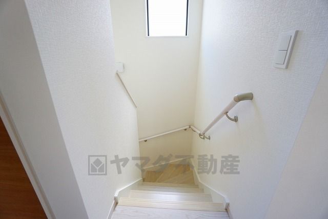小さなお子様やご高齢の方でも安心できる、手すり付き階段。段差も低めで設定されており、安全性にも優れています。