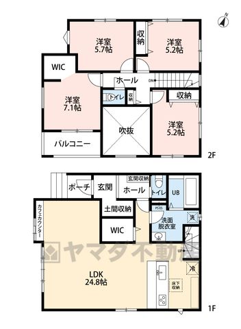 LDK24.8畳(1F)、洋7.1畳(2F)、洋5.7畳(2F)、洋5.2畳(2F) |