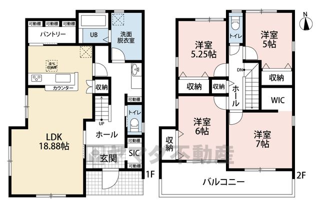 LDK18.8畳(1F)、洋7畳(2F)、洋6畳(2F)、洋5.2畳(2F)、洋5畳(2F) |