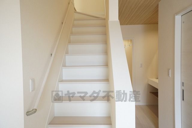 ご年配の方でも安心できる、手すり付き階段です^^段差も低めで設定されてますので安全性にも優れてますね^^