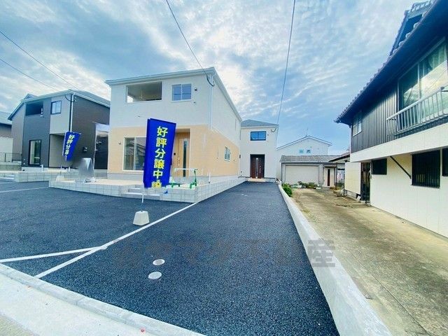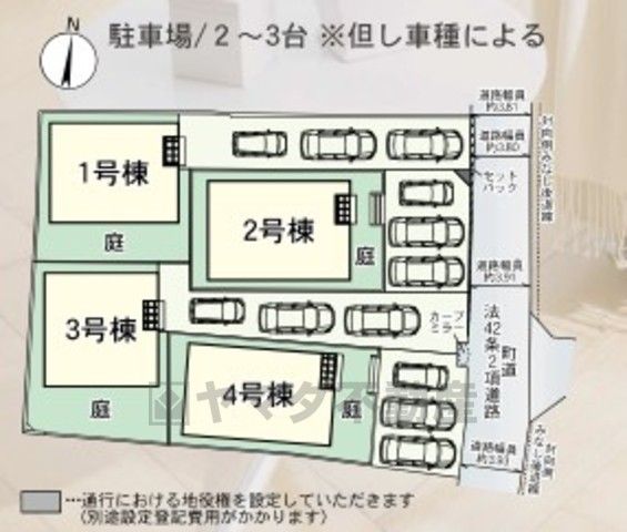 1号棟。全4区画。カースペース3台^^ 前面道路は東側4m。駐車場とは別にお庭付きです^^