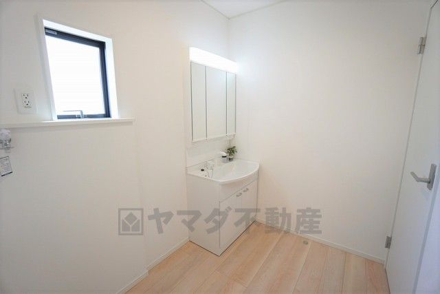 同仕様写真。三面鏡つき洗面台。収納も一体型になっているので、ドライヤーやヘアアイロンの置き場に困りませんね。