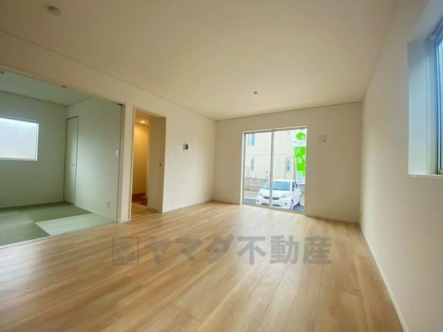 大きな窓のあるリビングは、陽光あふれる明るい空間です。居心地良く、ご家族皆がゆったり寛げる憩いの空間となりそうです。