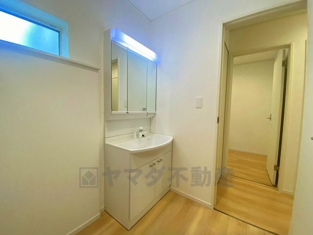 三面鏡つき洗面台。収納も一体型になっているので、ドライヤーやヘアアイロンの置き場に困りませんね。