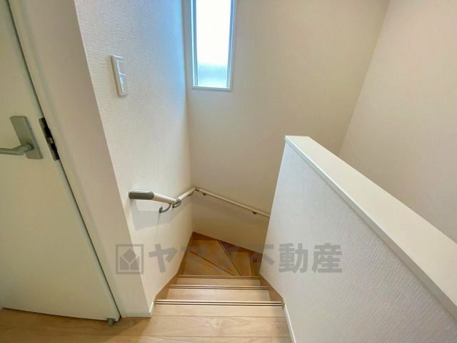 ご年配の方でも安心できる、手すり付き階段です^^段差も低めで設定されてますので安全性にも優れてますね^^