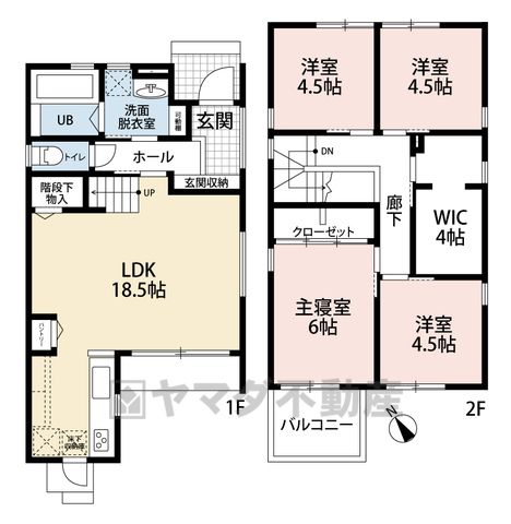 LDK18.5畳(1F)、洋6畳(2F)、洋4.5畳(2F) |