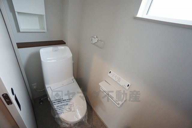 温水洗浄機付トイレです。節水機能もあるので、安心して使えますね。もちろん、1階2階の2ヶ所にトイレがあるので、忙しい朝にもゆとりができますね。