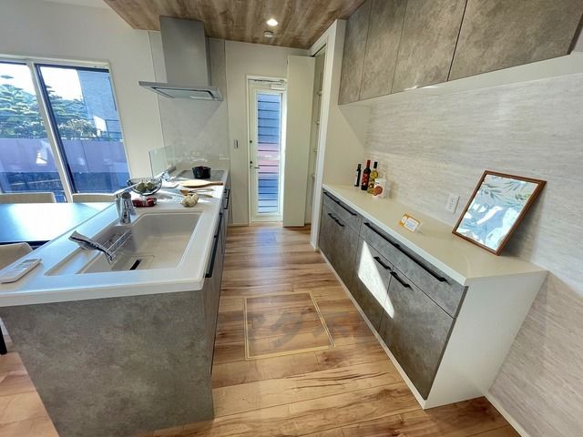 対面式カウンターキッチンでお子様の様子が見守れます。カウンタートップは耐熱性に優れており、日ごろのお掃除もふき取るだけでOK。ステンレスシンクも簡単にお掃除できますよ。