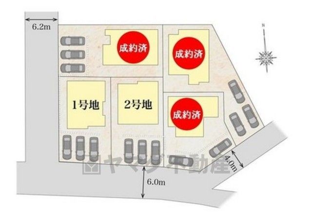 1号棟。カースペース3台分確保^^ 前面道路は4~6.2m。スムーズに駐車が出来ます^^