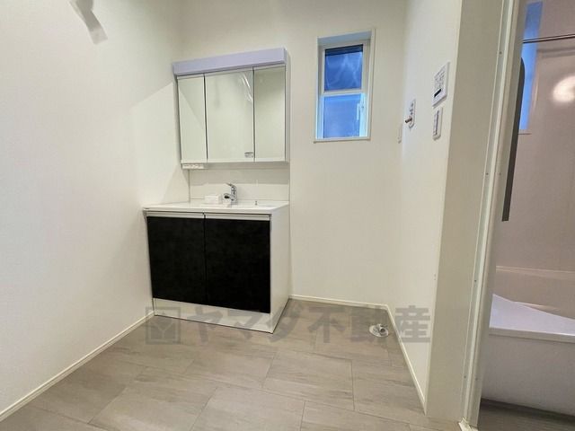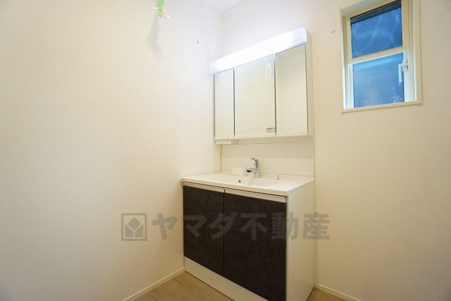 三面鏡つき洗面台。収納も一体型になっているので、ドライヤーやヘアアイロンの置き場に困りませんね。